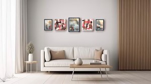 Composition de toiles abstraites et brodées, et de plexiglass avec peintures abstraites et figuratives et collages de fils de coton issues de l’exposition « GRIMPANTES »