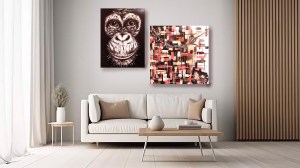 Composition de toiles, abstraites et figuratives brodées, et d’une peinture figurative issues de l’exposition « GRIMPANTES »