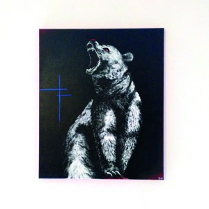 Peinture acrylique figurative noire, rouge et bleu sur toile, 50 x 72 cm