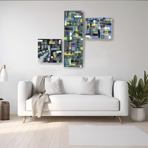 Peinture acrylique abstraite et figurative sur toile, broderie abstraite et figurative fils de coton, 50 x 50 cm, 40 x 120 cm et 60 x 40 cm -DISPONIBLE BOUTIQUE-