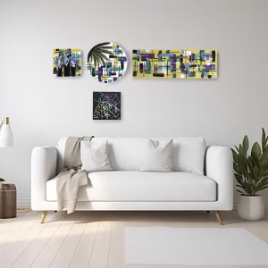 Peinture acrylique abstraite et figurative sur toile, broderie abstraite et figurative fils de coton, Collage impression collaboration avec le dessinateur et graphiste NoPantsMan, 30 x 30 cm, 50 cm diamètre, 90 x 30 cm et 30 x 30 cm