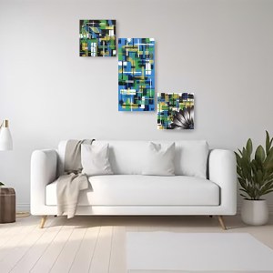 Peinture acrylique abstraite et figurative sur toile, broderie abstraite et figurative fils de coton, Composition de trois toiles 30 x 30 cm, 30 x 60 cm et 30x 30 cm