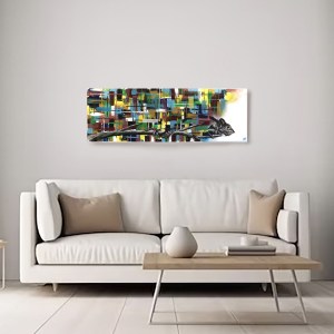 Penture acrylique abstraite et figurative sur toile, broderie abstraite fils de coton, 120 x 40 cm