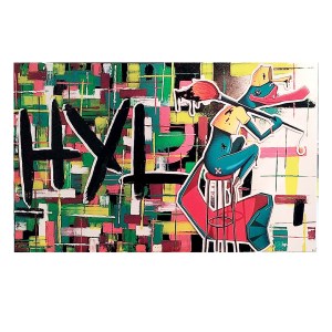 Peinture acrylique abstraite et collage impression, collaboration avec dessinateur et graphiste NoPantsMan, 120 x 76 cm