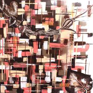 Penture acrylique abstraite et figurative sur toile, broderie abstraite et figurative fils de coton, 80 x 80 cm